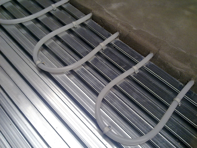 Os tubos são fixados às flanges superiores do perfil LEWIS através de grampos ou calhas. A distribuição uniforme do calor é transferida dos tubos para as chapas e para o interior da laje do piso.